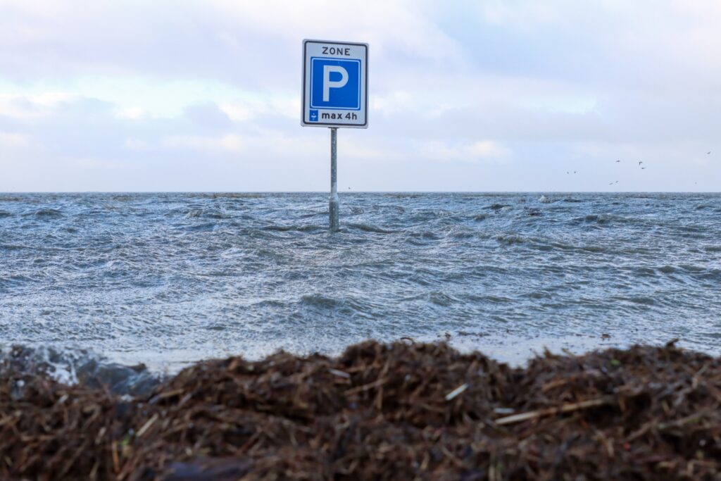 Dieren die in de kwelders leven moeten het hogerop zoeken. Een haas slaagde er nog net in om zwemmende het droge te bereiken. Doodsbange lag het diertje in de vloedlijn voordat hij door een voorbijganger naar een droge en beschutte plek werd gebracht.