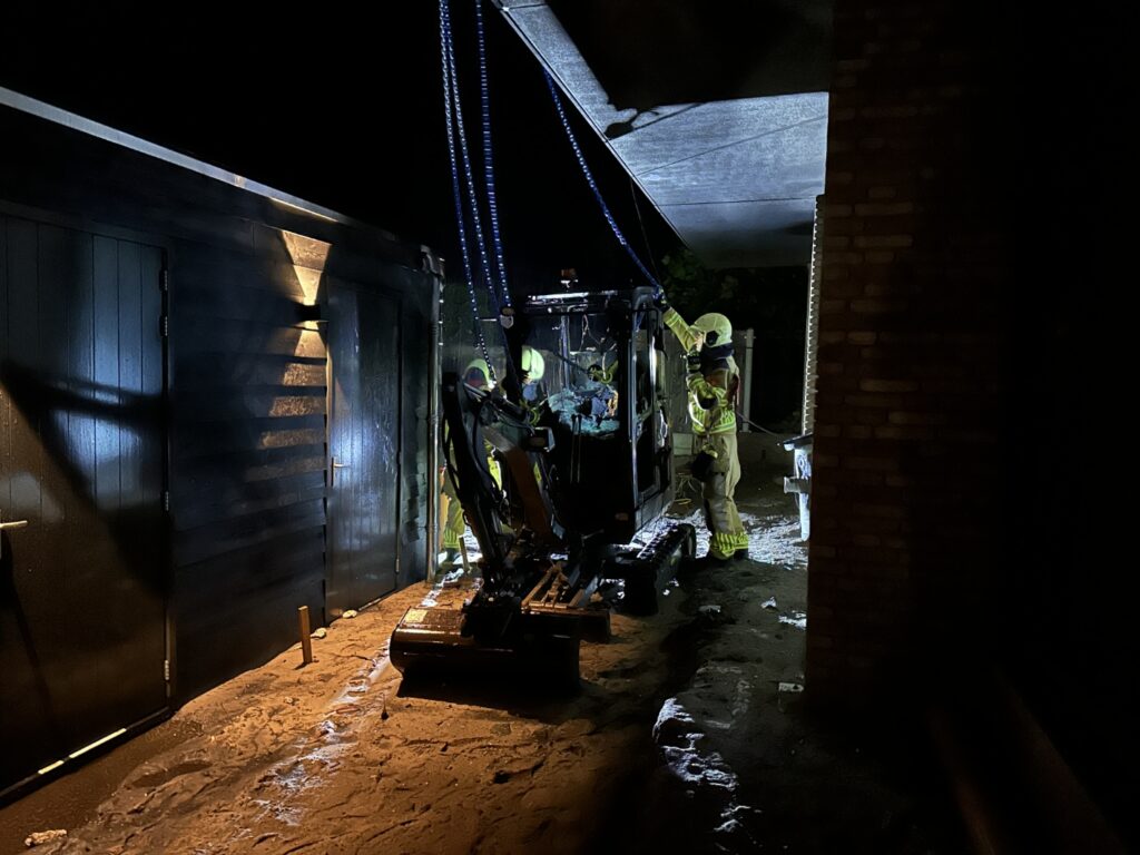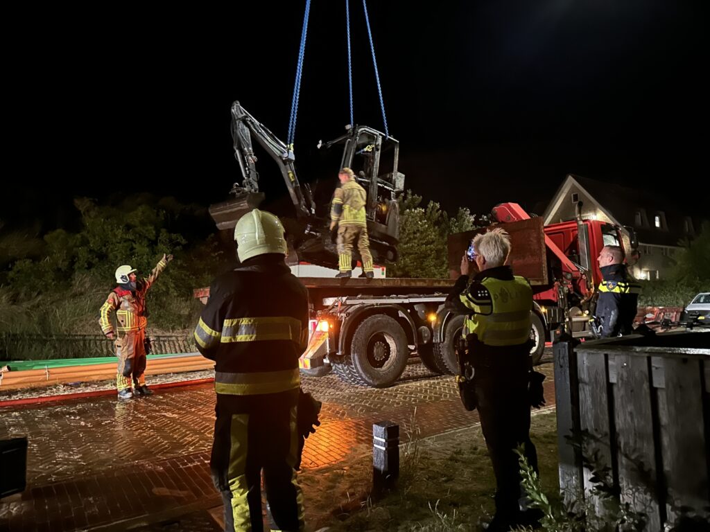 Met een hijskraan is de graafkraan weg getakeld om vervolgens naar een terein van de gemeente te brengen.