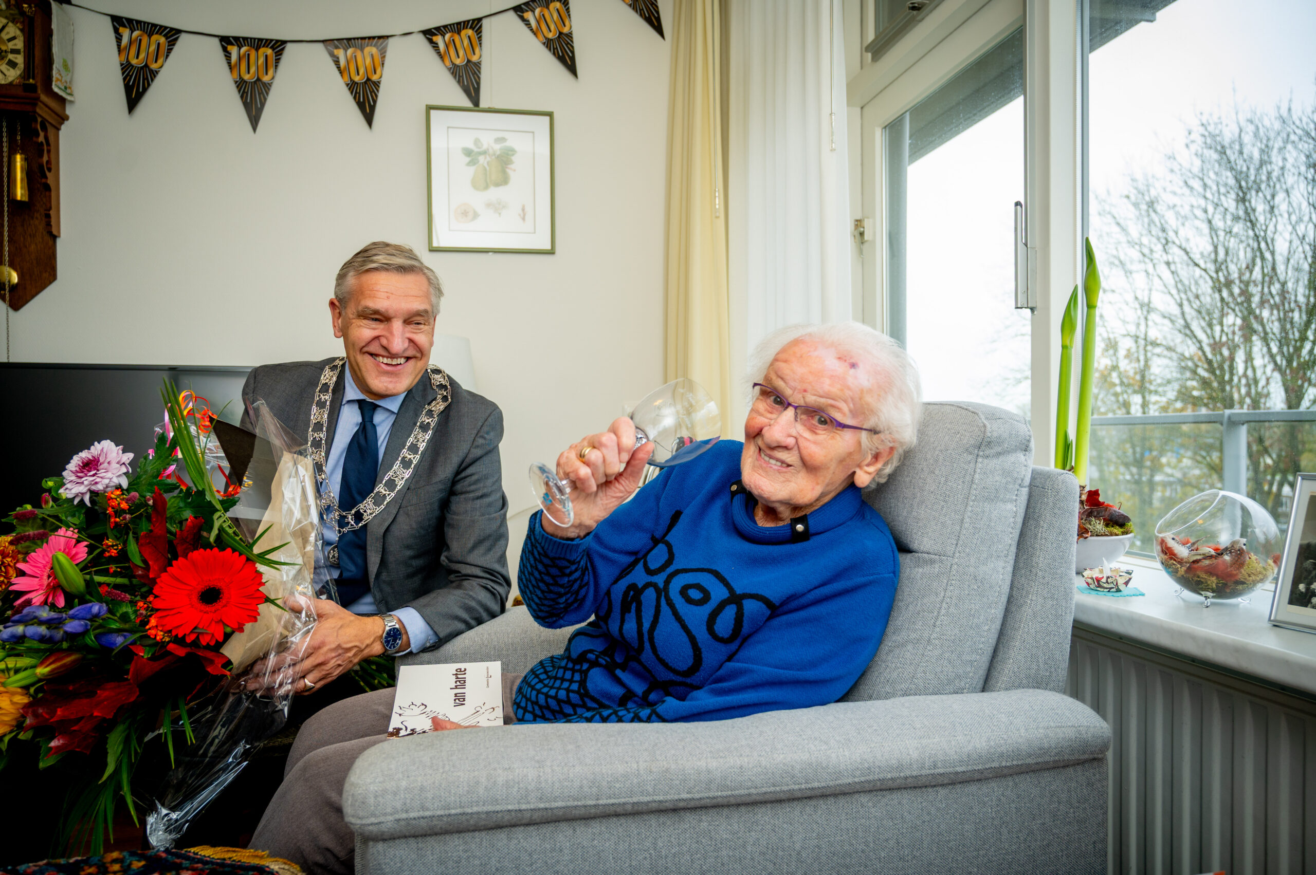 Maandag 3 november bracht burgemeester Sybrand Buma een feestelijk bezoek aan mevrouw Sjoukje de Vries-Geurts, die op 2 november haar 100e verjaardag vierde.