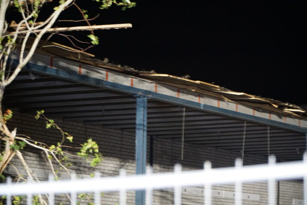 Om te voorkomen dat de losse platen verder losraken en mogelijk schade aan nabijgelegen panden veroorzaken, werd besloten om het dak tijdelijk te verstevigen. Een zware balk werd geplaatst om de platen in positie te houden. Hiervoor werd een kraanmachinist ingeschakeld, die ter plekke kwam om de benodigde werkzaamheden uit te voeren.