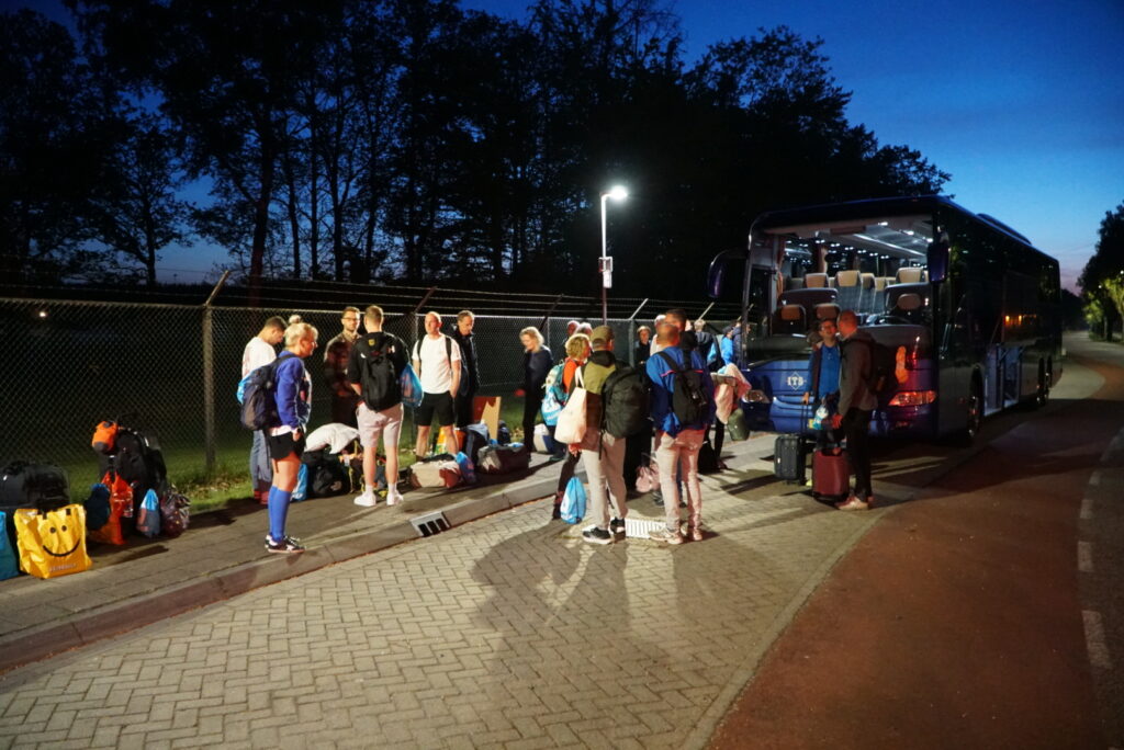 In Havelte bij de Johannes Postkazerne verzamelden zich donderdagmorgen de deelnemers. In bussen vertrekken de mensen richting Normandië.