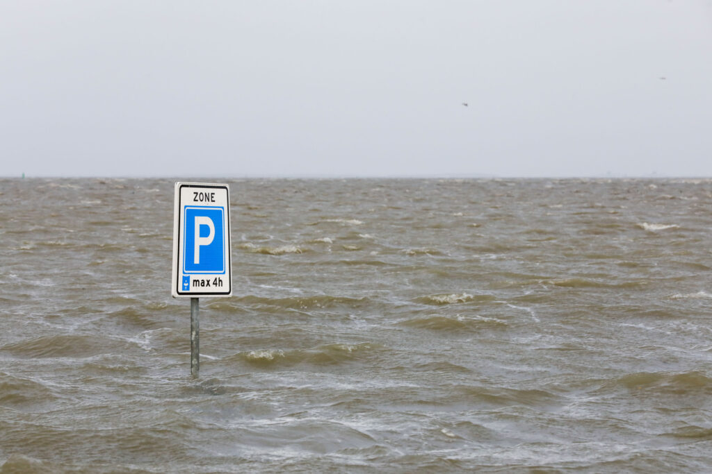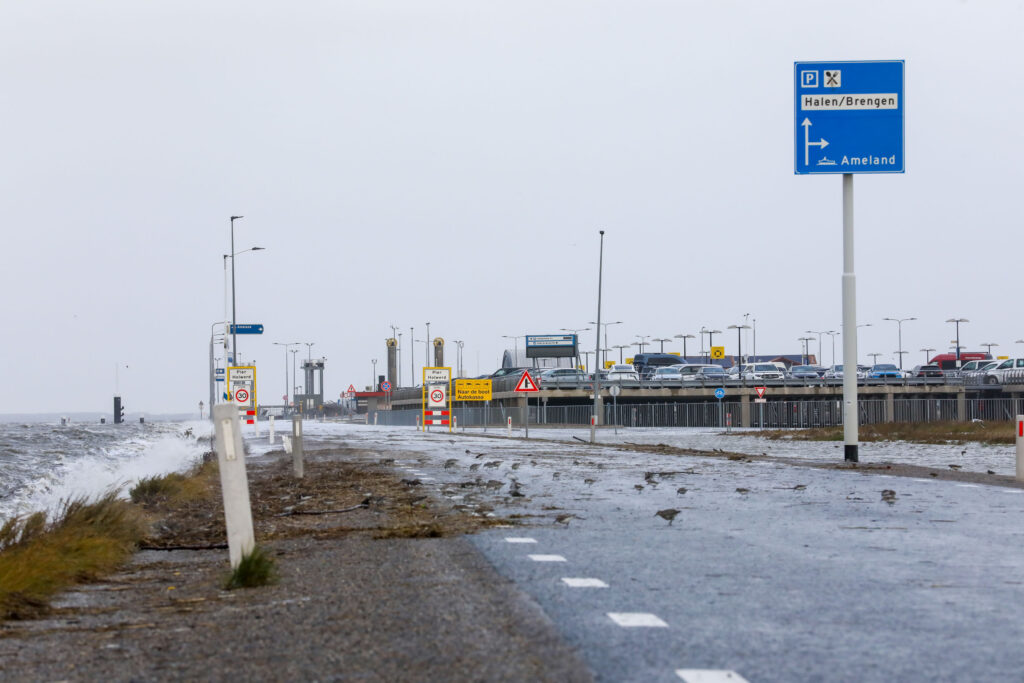 Het water in de Waddenzee is opgestuwd door storm Amy. Fietspaden en parkeerterreinen op de veerdam staan onder water. Vanwege de veiligheid is de dam volledig afgesloten.