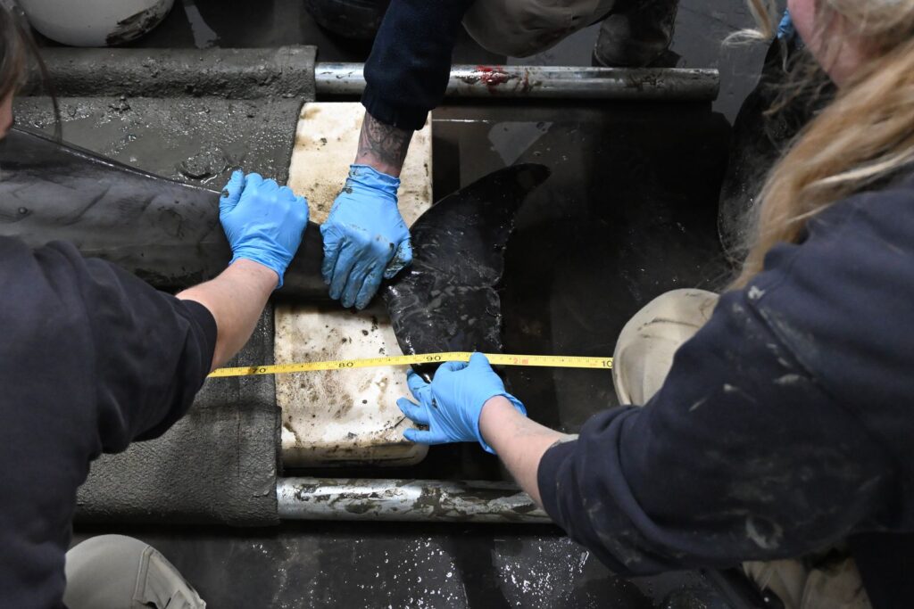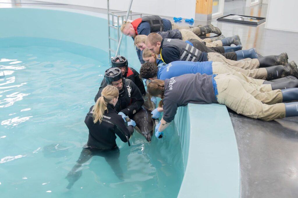 De dolfijn is 1,95 meter lang en weegt 82 kilo. Naast het afnemen van bloed worden ook andere controles uitgevoerd om haar conditie in kaart te brengen. De komende dagen moeten uitwijzen hoe haar herstel zich ontwikkelt. Volgens de verzorgers is het nog te vroeg om voorspellingen te doen, maar ze spreken van een voorzichtige vooruitgang.