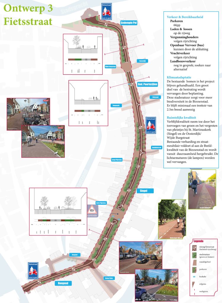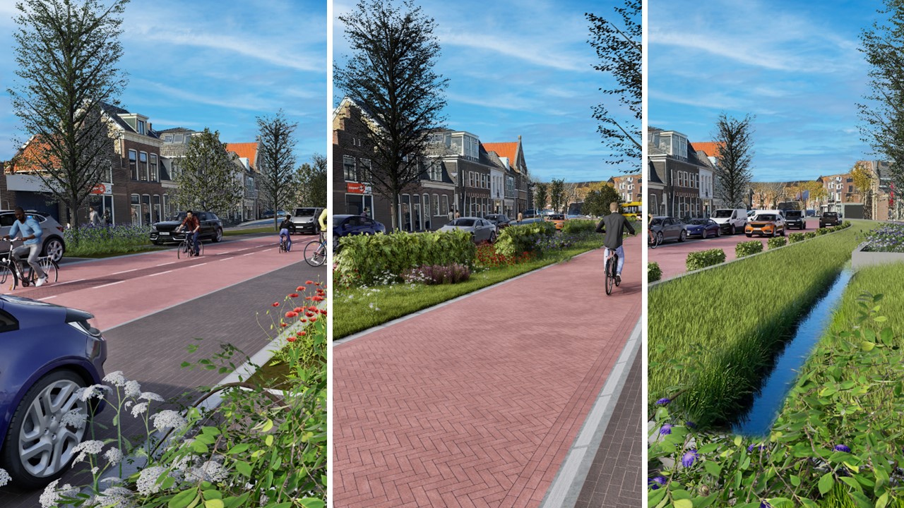 In dit ontwerp staat de fietser centraal en zijn auto’s te gast. Aan weerszijden van de straat zorgen brede stroken met bomen en planten voor een aantrekkelijke en gezellige uitstraling. Ook komen er twee fijne pleintjes om te zitten.