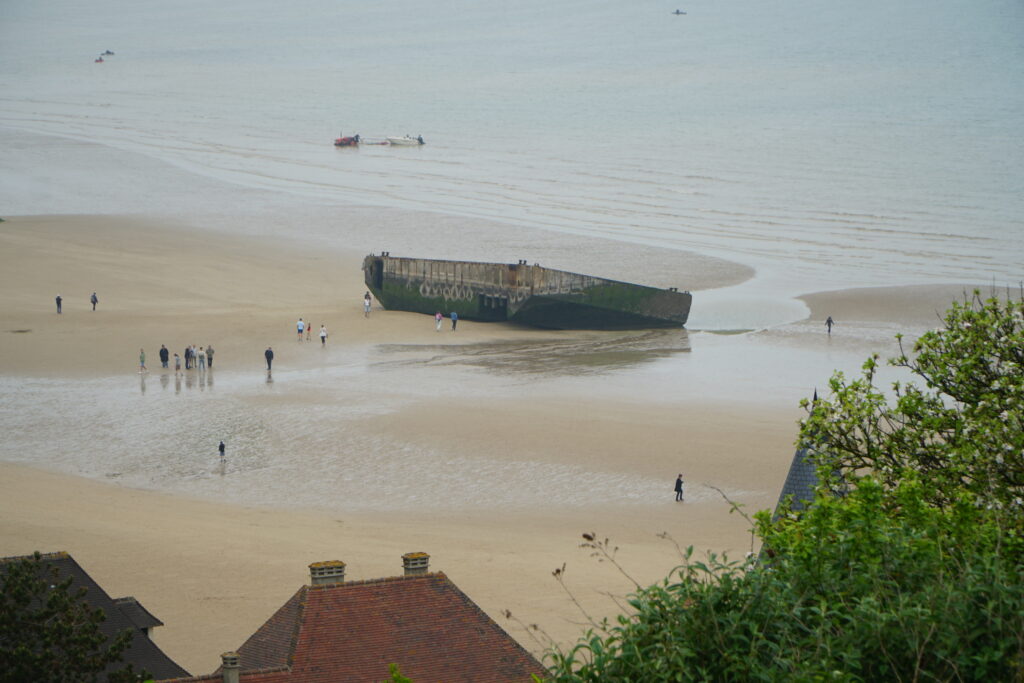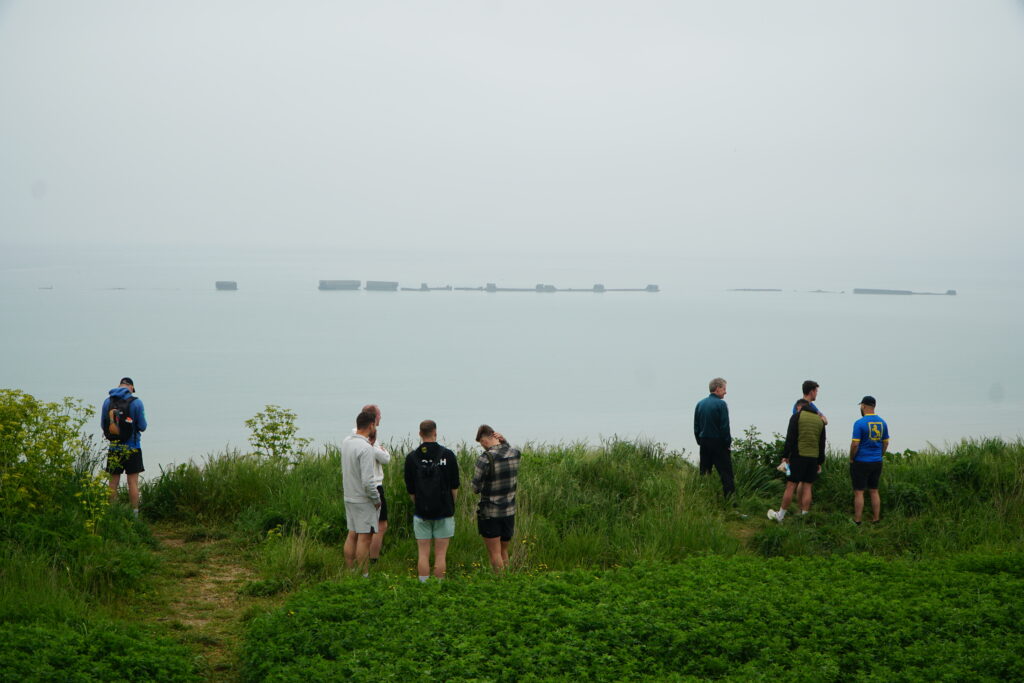 De groep staat daar waar ooit de Mulberryhaven lag – een technisch meesterwerk uit oorlogstijd. Na de landing in Normandië bouwden de geallieerden hier een tijdelijke haven om troepen en materieel veilig aan land te krijgen. Oude schepen werden tot zinken gebracht om een golfbreker te vormen, en gigantische betonnen caissons – de Phoenix-caissons – creëerden beschutting voor drijvende pieren en bruggen. De haven was cruciaal voor het verdere verloop van de bevrijding van Europa.