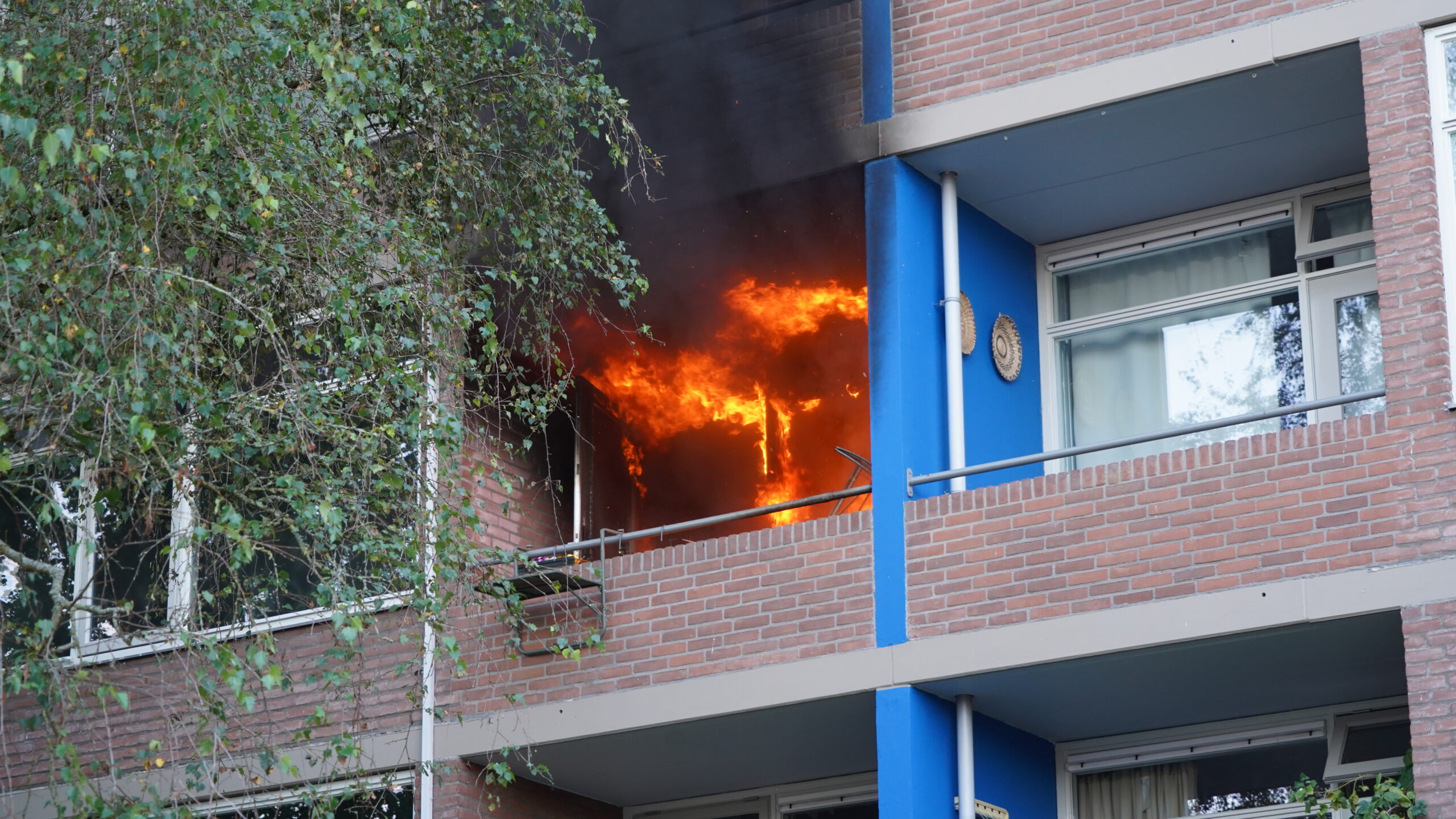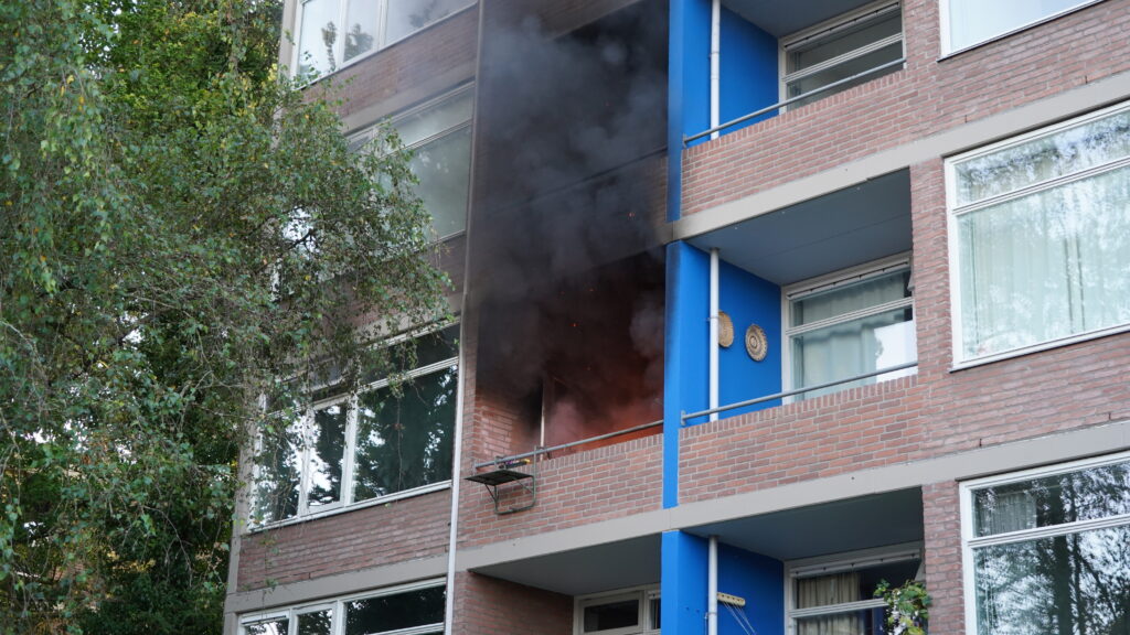 De brandweer is met meerdere voertuigen aanwezig om het vuur te bestrijden. De brand woedt in een appartement op de tweede verdieping in het flatgebouw. Bij de brand, waarbij de vlammen van een balkon sloegen, komt flink wat rook vrij.