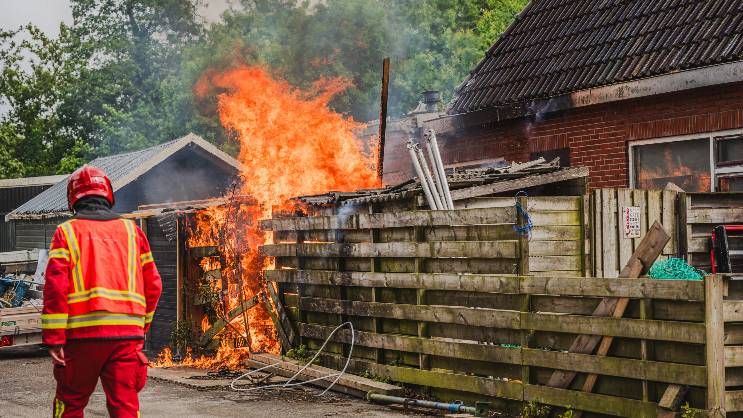 De brand is uitslaand en gaat gepaard met flinke rookontwikkeling. De vlammen sloegen uit het schuurtje en hebben de dakgoot van de naastgelegen woning aangestraald.