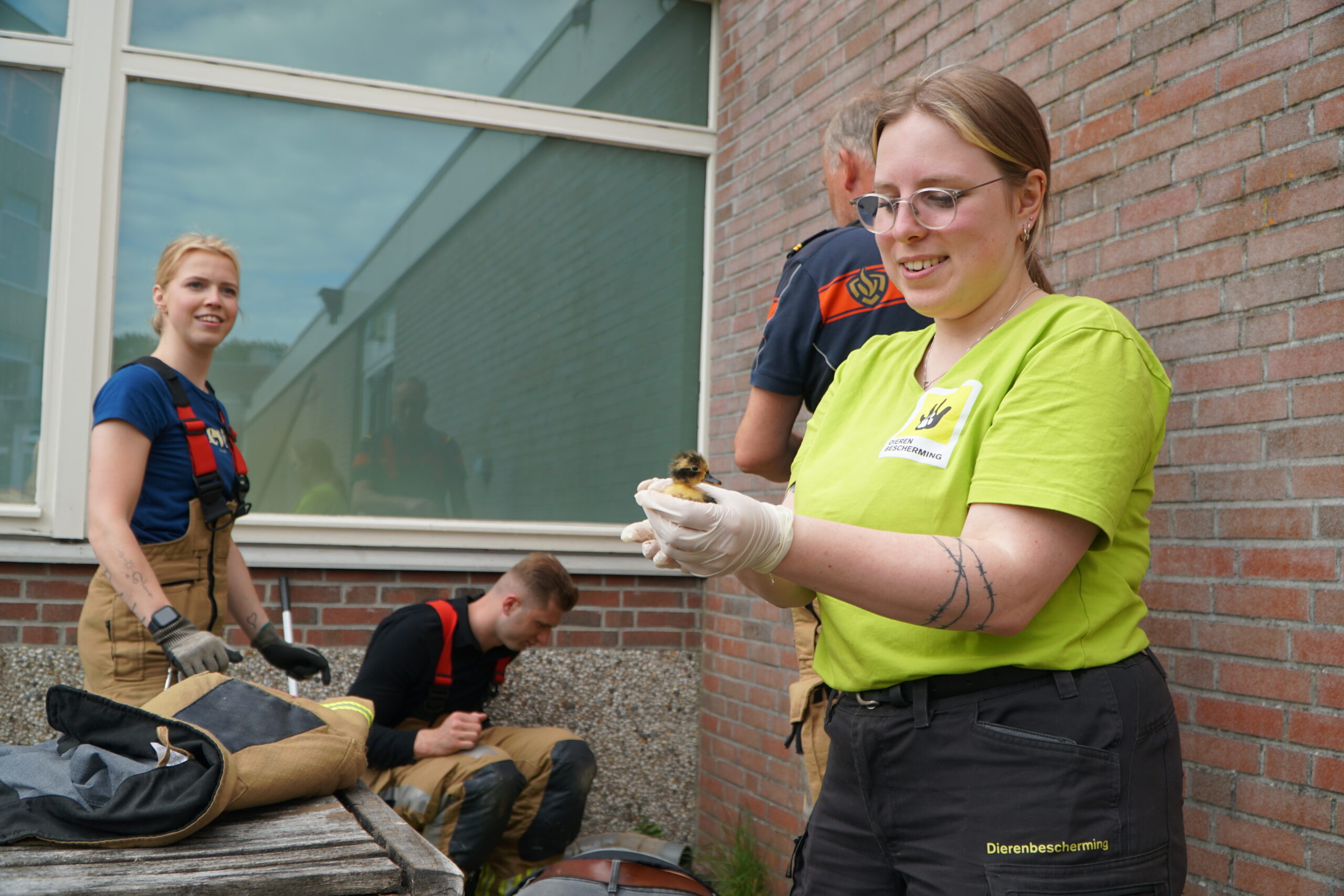 Uiteindelijk wist de brandweer één van de zes kuikens te bevrijden. De moedereend en het geredde kuiken maken het naar omstandigheden goed.