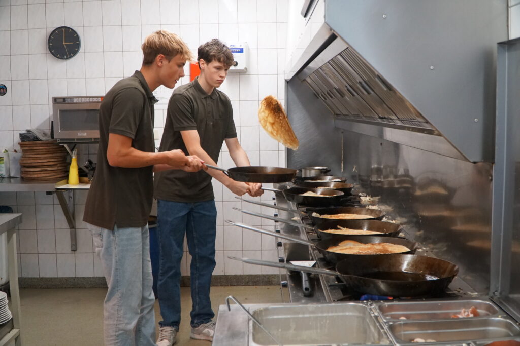 Toch was er vandaag een klein lichtpuntje. Restaurant De Koppenjan, het pannenkoekenrestaurant van Jubbega, besloot de jeugd te verrassen met een smakelijke traktatie: 50 verse pannenkoeken, gebakken door Djovanny Nieuwland en Sverre Koopmans. “Ik heb wel even moeten oefenen om de pannenkoeken goed in de lucht te gooien. Het duurt ongeveer zeven maanden voordat je zo’n pannenkoek netjes weer in de pan vangt!” aldus Djovanny. De jongens genoten zichtbaar van het bakken.