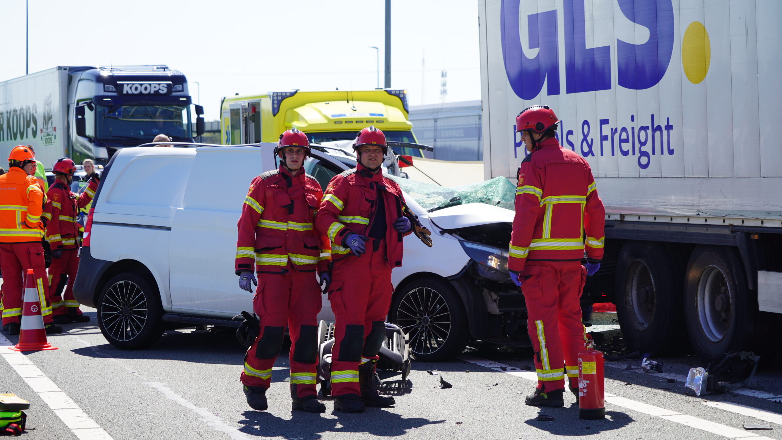 De bestelbus raakte zwaar beschadigd en de bestuurder liep ernstige verwondingen op. Hulpdiensten kwamen massaal ter plaatse, waaronder een traumahelikopter. Om het zicht op het ongeval te beperken, zijn schermen geplaatst.