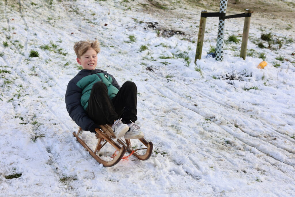 In Oranjewoud roetsjen kinderen met hun slee van de heuvels af en worden flinke snelheden gehaald.