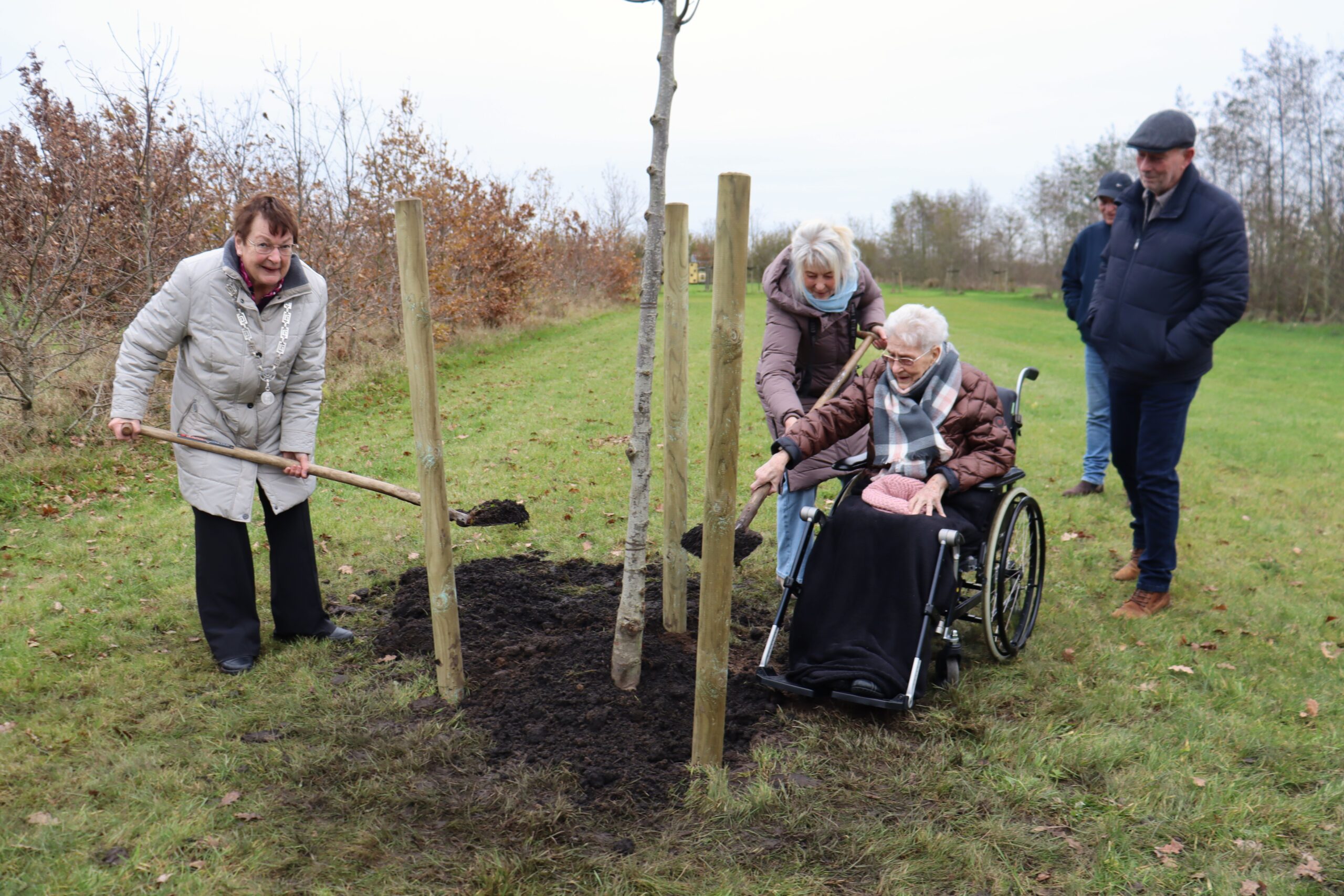Burgum – Het was een bijzonder en feestelijk moment dinsdag in het Wetter en Willepark. Mevrouw Fetsje Vijverda-van der Heide (100) plantte daar samen met haar familie en burgemeester Tineke Schokker een boom in het ‘100-jierrigen bosk’.