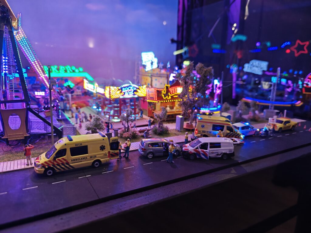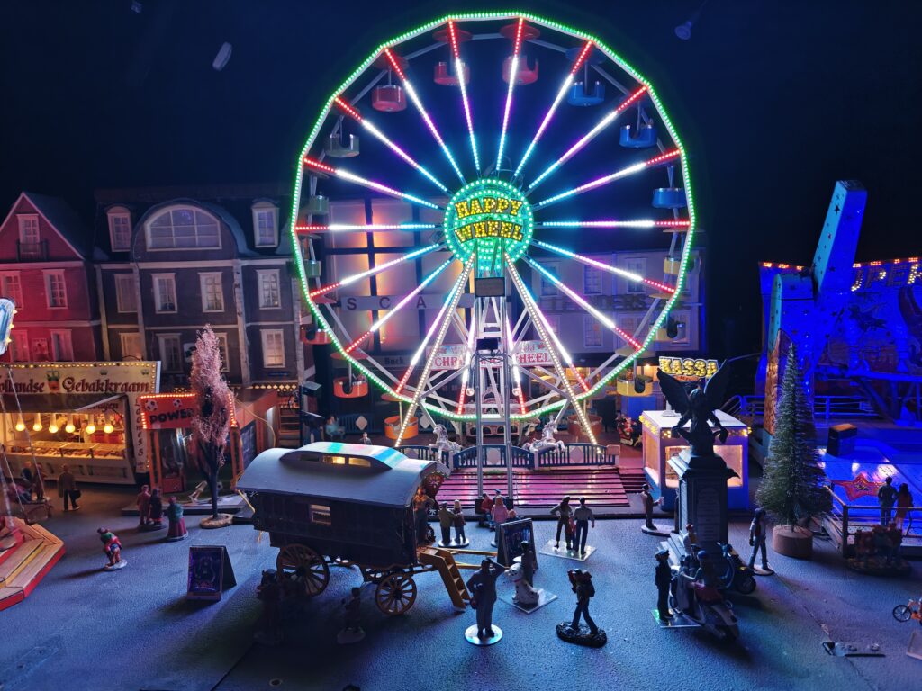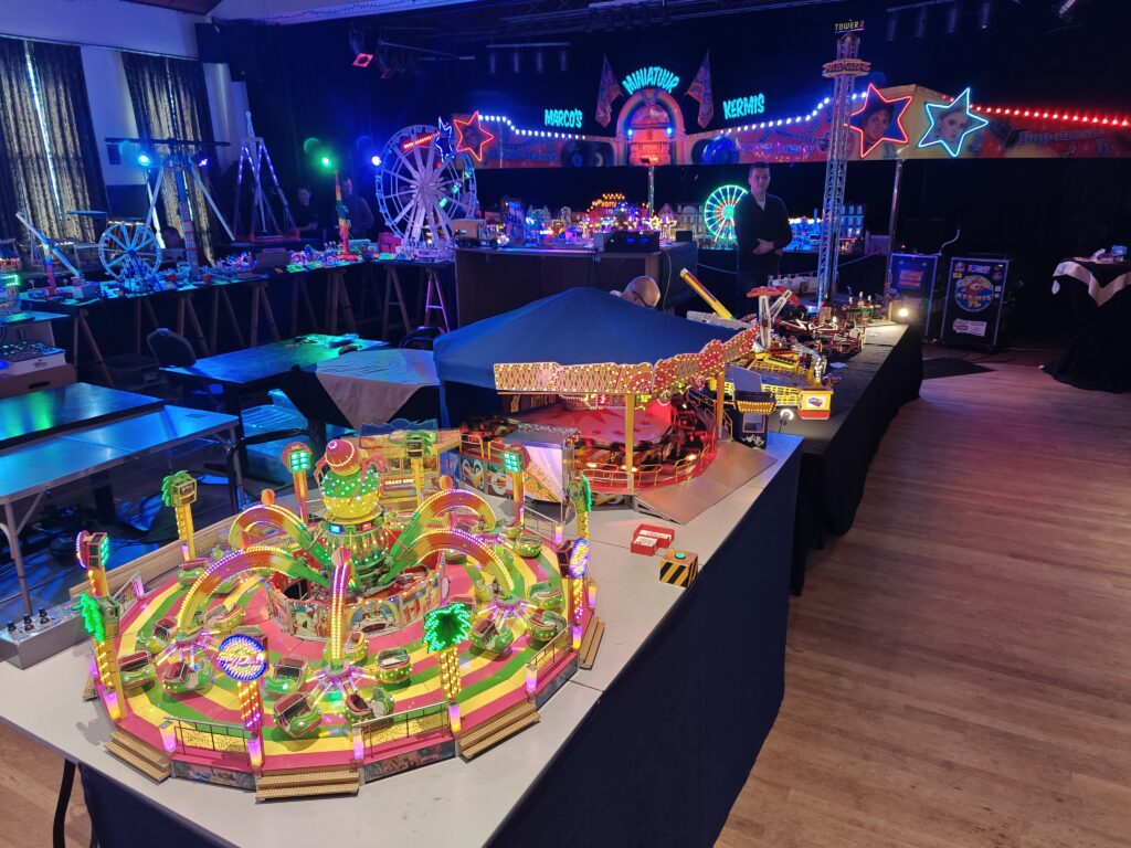 De miniaturen zijn opgebouwd met uiteenlopende materialen. Sommige onderdelen zijn handgemaakt met zelfbouwmaterialen, andere attracties zijn geconstrueerd met LEGO en K’NEX. Die mix zorgt voor een afwisselend beeld: van strak afgewerkte modellen tot creaties waarin de bouwtechniek zichtbaar blijft, maar altijd met oog voor het kermisgevoel.De bouwers hebben veel aandacht besteed aan de afwerking, met kleine decoraties en herkenbare elementen die kermisattracties hun typische uitstraling geven. Daardoor wanen bezoekers zich al snel op een echte kermis, maar dan in het klein.