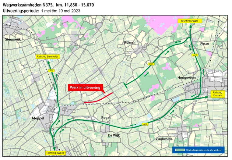 De eerste drie weken van mei worden er wegwerkzaamheden uitgevoerd aan de N375 tussen Pesse en Meppel-Noord. Het wegdeel tussen de rotondes Broekhuizen/Oosterbroekenweg en de rotonde Weerwille krijgt een nieuwe laag asfalt. De werkzaamheden duren van maandag 1 mei tot en met vrijdag 19 mei 2023.