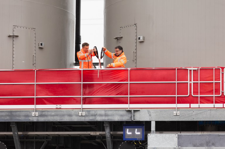 Bestuurslid Remco van Maurik en hoofdaannemer Van Hattum en Blankevoort verrichtten de opening bij twee nieuwe slibsilo’s. In de installatie wordt het zuiveringsslib van 26 rioolwaterzuiveringen in Fryslân verzameld en ontwaterd.