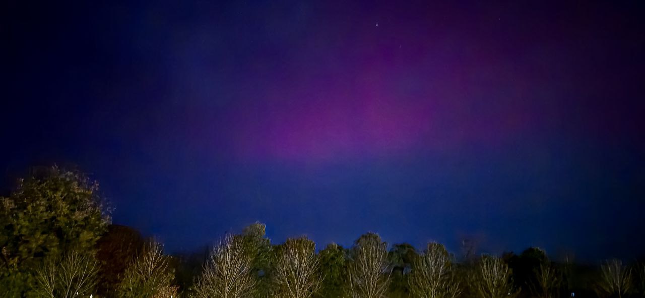 De beelden tonen een zachte gloed boven de bomen en daken van de stad. Door de heldere lucht en verhoogde zonneactiviteit was het fenomeen korte tijd zichtbaar.