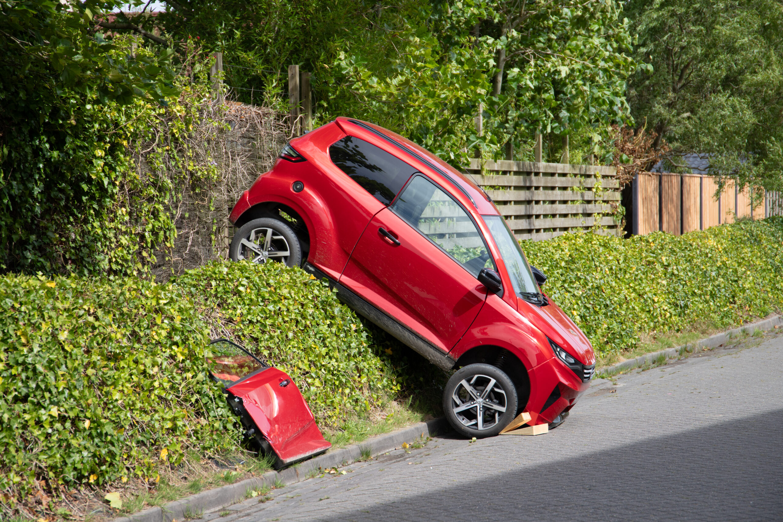 Opmerkelijk ongeval in Stiens: Auto bovenop bosschages