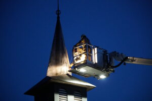 Oudehorne – De brandweer is maandagavond in actie gekomen bij de kerk aan de Schoterlandseweg in Oudehorne.