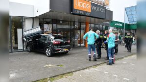 Heerenveen – De bestuurder van een KIA is vrijdagmiddag tegen de gevel van een winkelpand aan het Turfschip in Heerenveen gereden.
