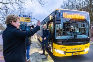 Leeuwarden – Vanochtend vroeg deelden gedeputeerde Matthijs de Vries en operationeel directeur van Qbuzz Anita Schrage wat lekkers uit aan reizigers op busstation Leeuwarden.