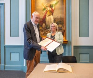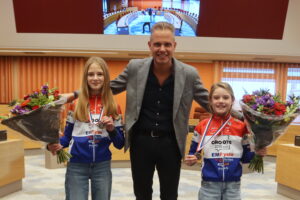 Emmen – Op donderdagmiddag 6 november 2025 huldigde wethouder Pascal Schrik twee Nederlands kampioenen mountainbiken. Puck Geerts (9) en Eline Scheve (11) uit Emmen komen uit voor WSV Emmen.