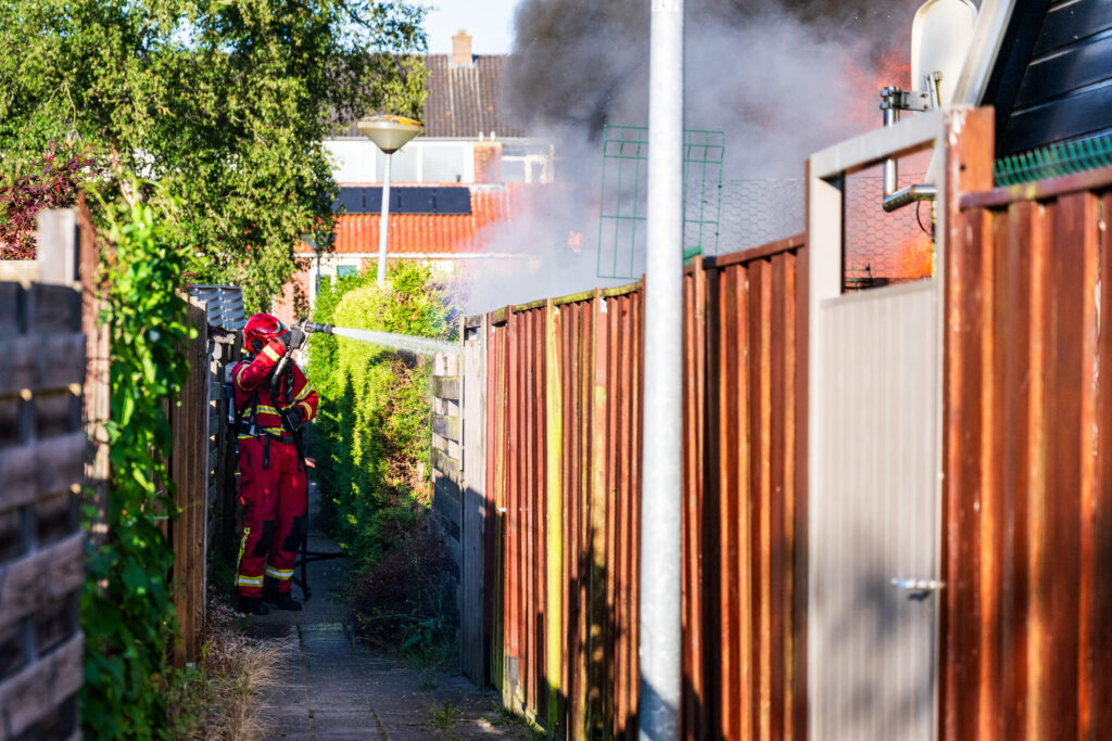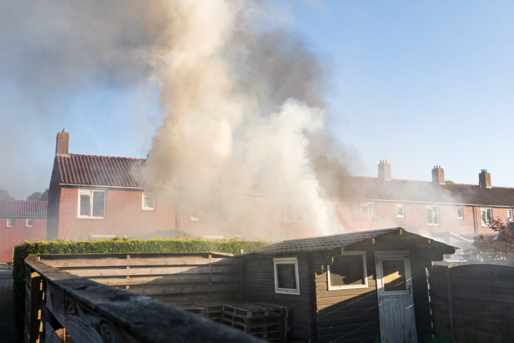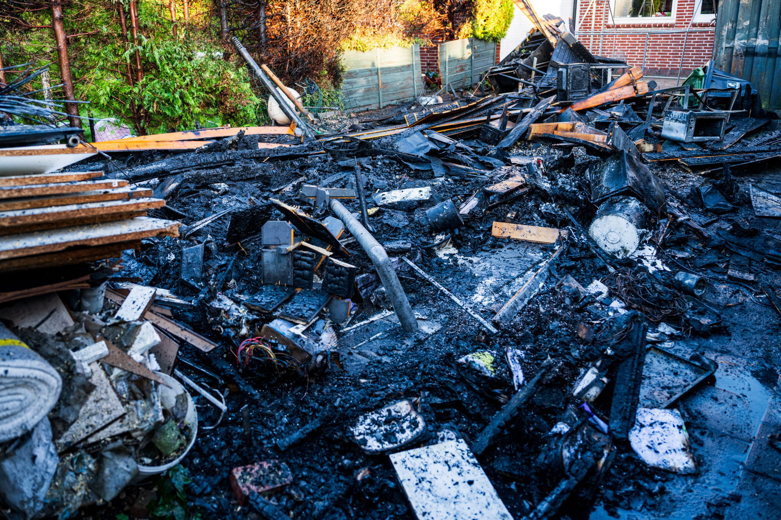 De brandweer rukte met twee voertuigen uit. Er kwam veel rook vrij bij de brand. De brandweer heeft een schutting open moeten breken om bij de brand te komen. Er raakte niemand gewond, maar de schade is enorm. Waardoor de brand kon ontstaan is niet bekend.