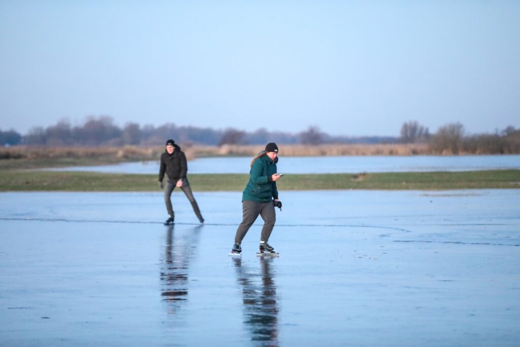 Waar ze hier op de eerste schaatsdag meestal vooral langs de kant kunnen schaatsen, schaatsen ze nu de hele polder over. Inmiddels staat er een handjevol mensen op het ijs. Dit aantal loopt straks waarschijnlijk snel op.