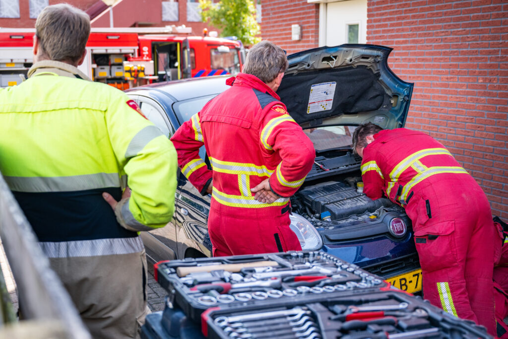 Het dier viel een meter of tien naar beneden en vluchtte onder de auto welke op de oprit stond. De eigenaren kregen het dier er niet onder weg en belden de brandweer. Na het demonteren van flink wat onderdelen kon de kat bevrijdt worden.
