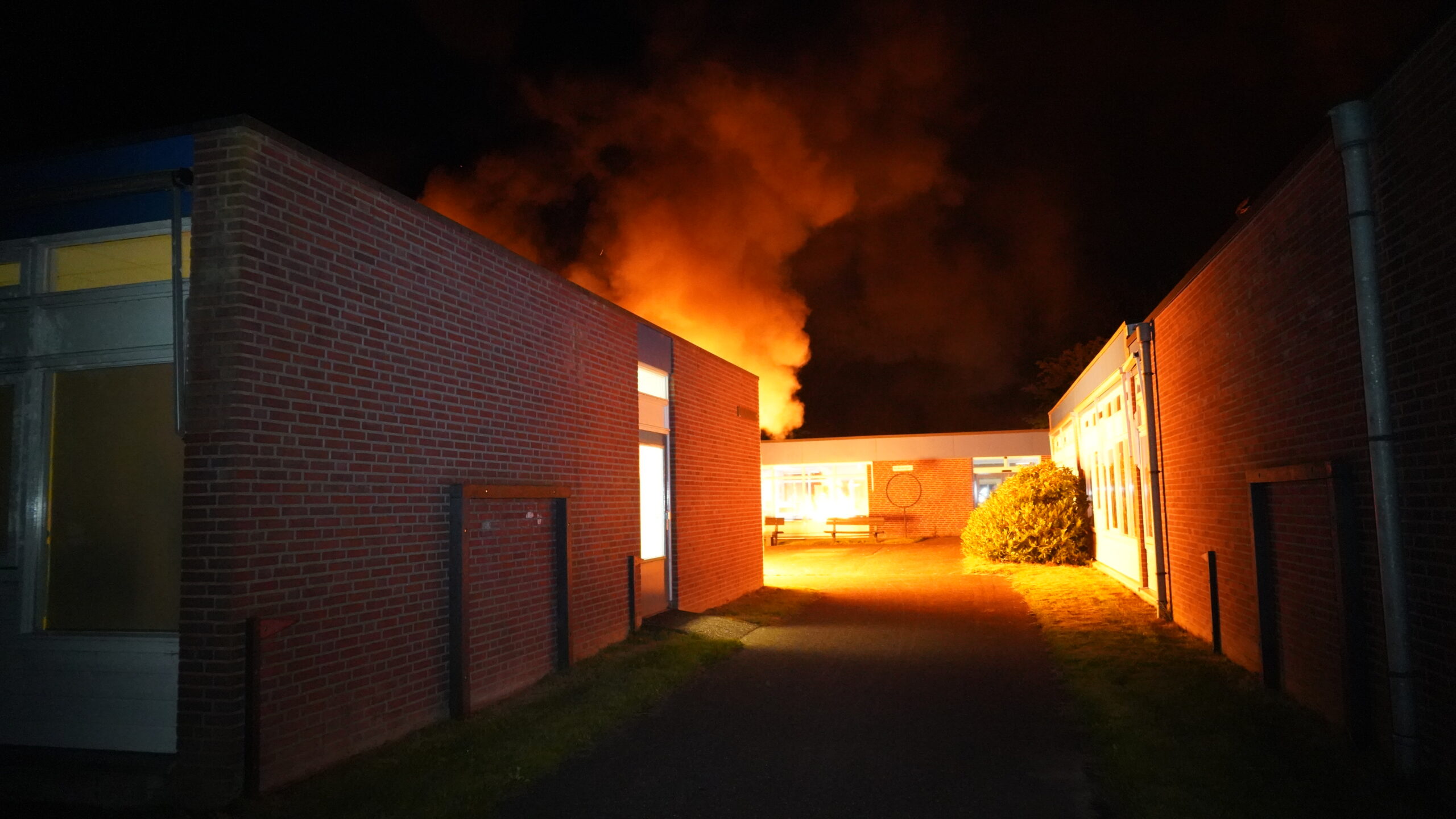 Haren – De brandweer is opgeroepen voor een uitslaande brand op een binnenplein van de Mytilschool in het Groningse Haren.