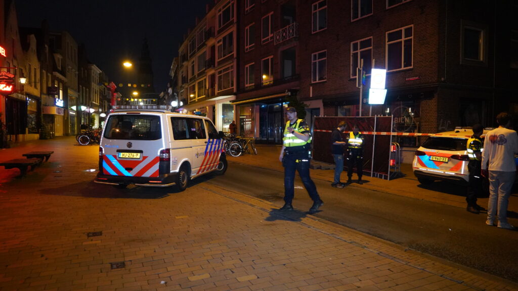 Omstreeks 03:30 uur kwam er een melding binnen van een steekincident. Ter plaatste troffen agenten een 25-jarige man uit Groningen aan die omstanders bedreigde met een mes. Agenten waarschuwden de man en riepen dat hij het mes moest laten vallen. Toen de verdachte hier geen gehoor aangaf, is de taser (stroomstootwapen) ingezet. De verdachte kon hierna worden overmeesterd en is ingesloten voor verhoor. De man wordt ervan verdacht een 20-jarige man en een 27-jarige man uit Groningen gestoken te hebben met een mes.