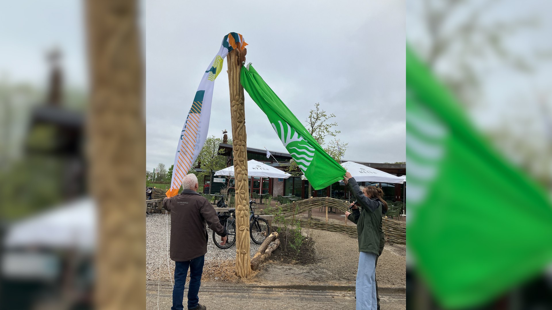 Bij het verlaten van de auto op de parkeerplaats, bevindt zich men meteen in de natuur. Na de toespraken was het tijd voor de openingshandeling door Hans Haerkens en Els Dubbink. Onder het toeziend oog van de vele genodigden en met een klein beetje hulp van een van de vrijwilligers, werd een houtkunstwerk onthuld. Deze met behulp van de kettingzaag versierde boomstam staat fier bij de entree van de fietsenstalling en is een echte eyecatcher.