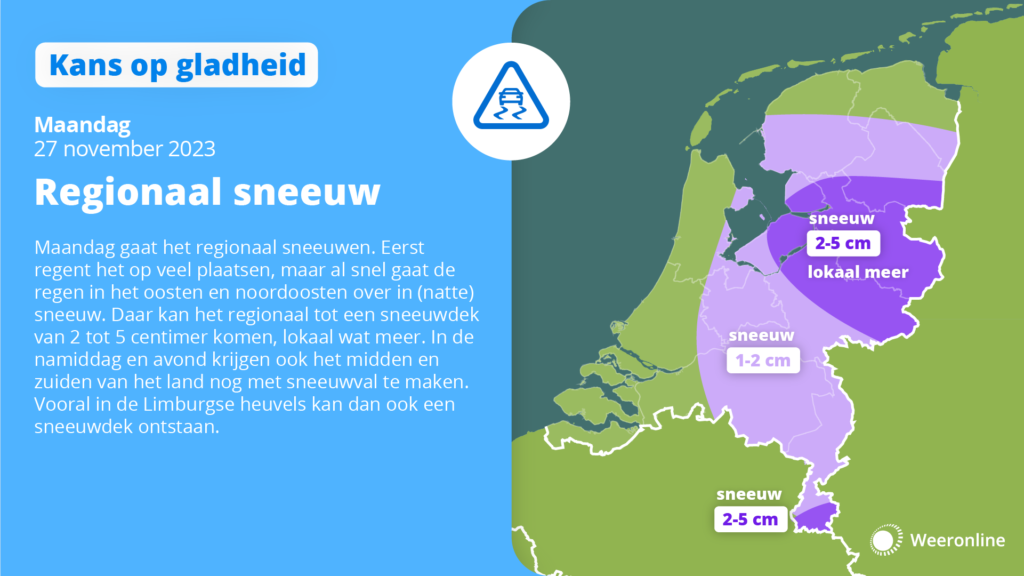 Dat verandert maandagochtend, wanneer de wind in het oosten en noordoosten draait naar oostelijke richtingen. Daardoor kan koudere lucht ons land binnentrekken en gaat de neerslag steeds vaker over in natte sneeuw. Om de regen over te laten gaan in sneeuw is het daarnaast van belang dat de neerslag intens genoeg is. In de loop van maandagochtend kan zich in dat geval langzaam een sneeuwdek van enkele centimeters gaan vormen in een strook over het noordoosten van het land. De sneeuw kan makkelijk blijven liggen op grasvelden, auto’s en tuintafels. Op de weg zal het wat langer duren voor zich een sneeuwdek kan vormen.